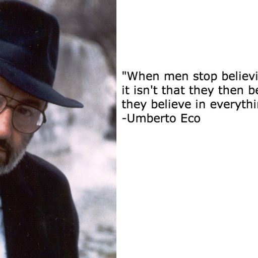 "When men stop believing in God, it isn't that they then believe in nothing: they believe in everything."- Umberto Eco (born on this date in 1932)