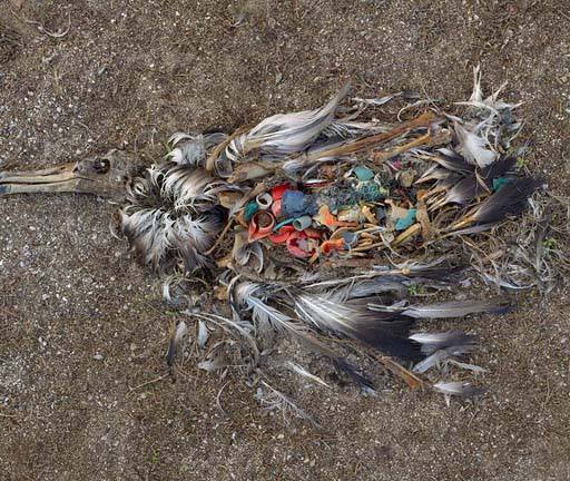 The image above depicts the body of an albatross that was found on Midway Atoll in the Pacific Ocean.