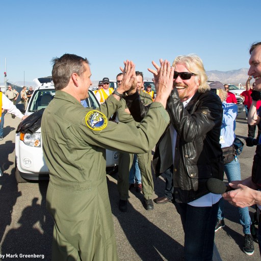 Sir Richard Branson & Forger, aka Mark Stucky congratulate each other after the success of Virgin Galactic's first rocket-powered flight that broke the sound barrier in a test over the Mojave Desert.