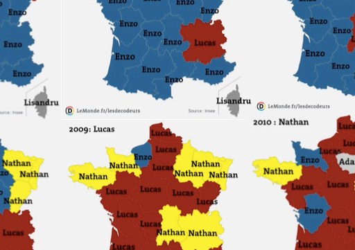On the map, the changing fortunes of French baby boys' names look like battles in a weird, unreported war.