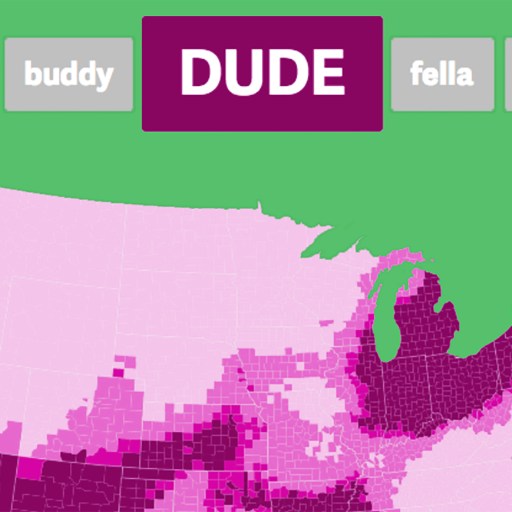 Using the location data attached to billions of tweets, these maps indicate where the five best friend words — bro, buddy, dude, fella, and pal — occur most frequently.