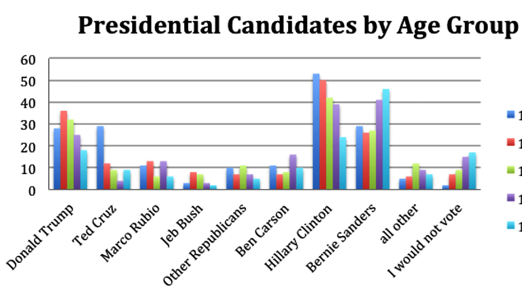 “If the election for U.S. president were held today, who would you vote for?” Response options included all of the Republican and Democratic candidates in the race at the time, along with options for “Other” and “I would not vote.”