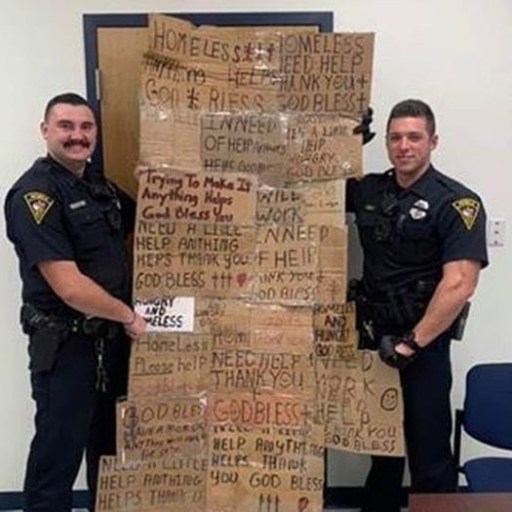 A photo showing two Alabama police officers bragging about a "homeless quilt" made from confiscated panhandling signs raises questions about the constitutionality of panhandling.