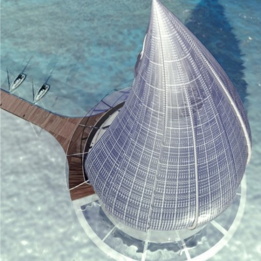 The image of a design by the Orlando de Urrutia Architectural Firm in Spain. The hotel is shaped like a drop of water and might sit on a dock extended over the sea as in these drawings.
