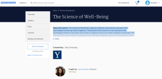 About this course: “The Science of Well-Being” taught by Professor Laurie Santos overviews what psychological science says about happiness. The purpose of the course is to not only learn what psychological research says about what makes us happy but also to put those strategies into practice. The first half of the course reveals misconceptions we have about happiness and the annoying features of the mind that lead us to think the way we do. The second half of the course focuses on activities that have been proven to increase happiness along with strategies to build better habits.