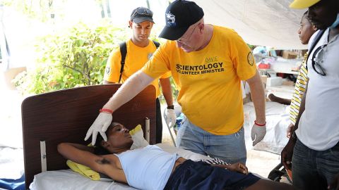 Dave McGregor, a Scientologist touches a patient at a hospital in Port-au-Prince on January 26, 2010. (Stan Honda/AFP/Getty Images)