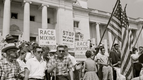 UNITED STATES - CIRCA 1959: people holding signs and American flags protesting the admission of the 'Little Rock Nine' to Central High School. (Photo by Buyenlarge/Getty Images)