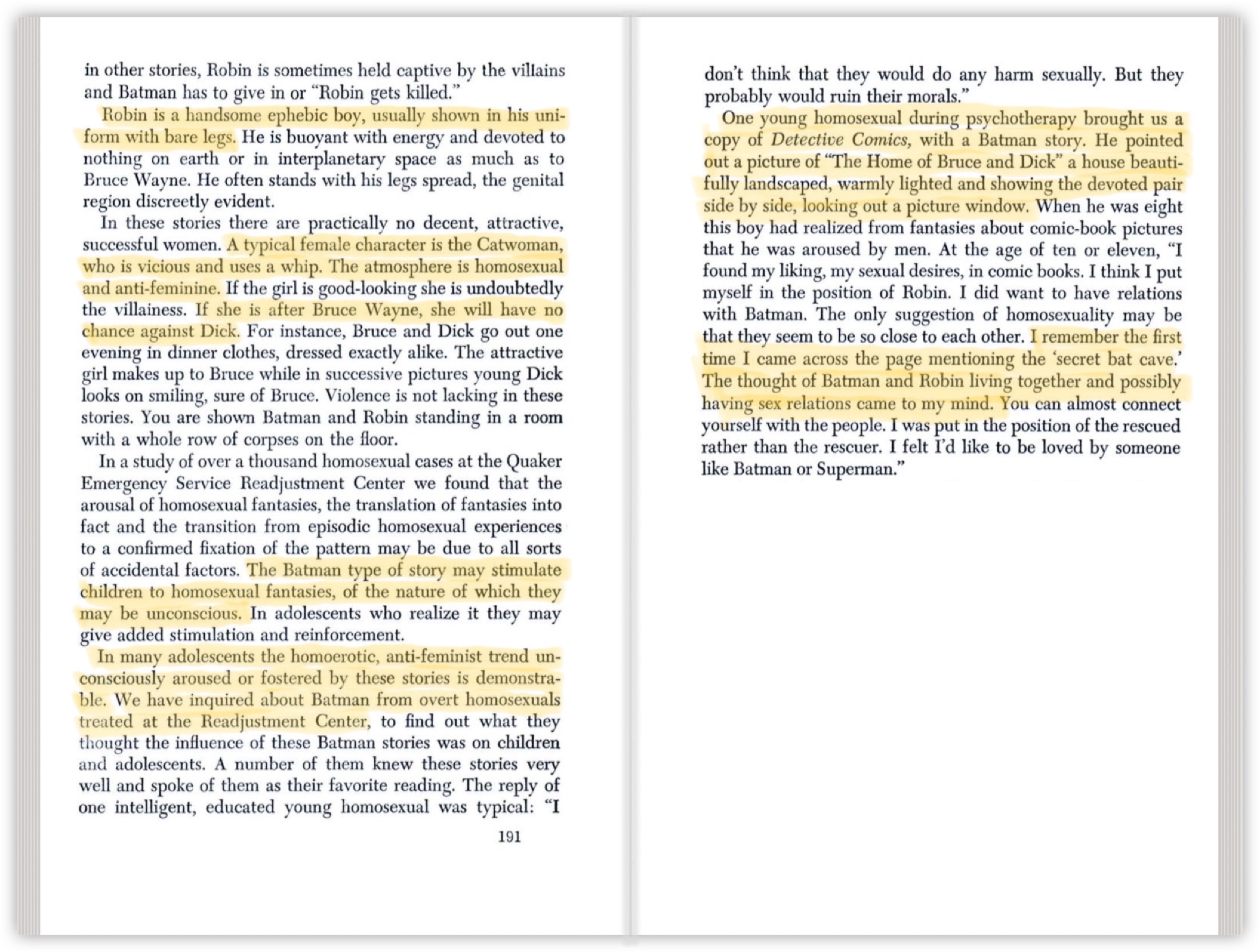 “One young homosexual during psychotherapy brought us a copy of Detective Comics, with a Batman story. He pointed out a picture of “The Home of Bruce and Dick” a house beautifully landscaped, warmly lighted and showing the devoted pair side by side, looking out a picture window.”
