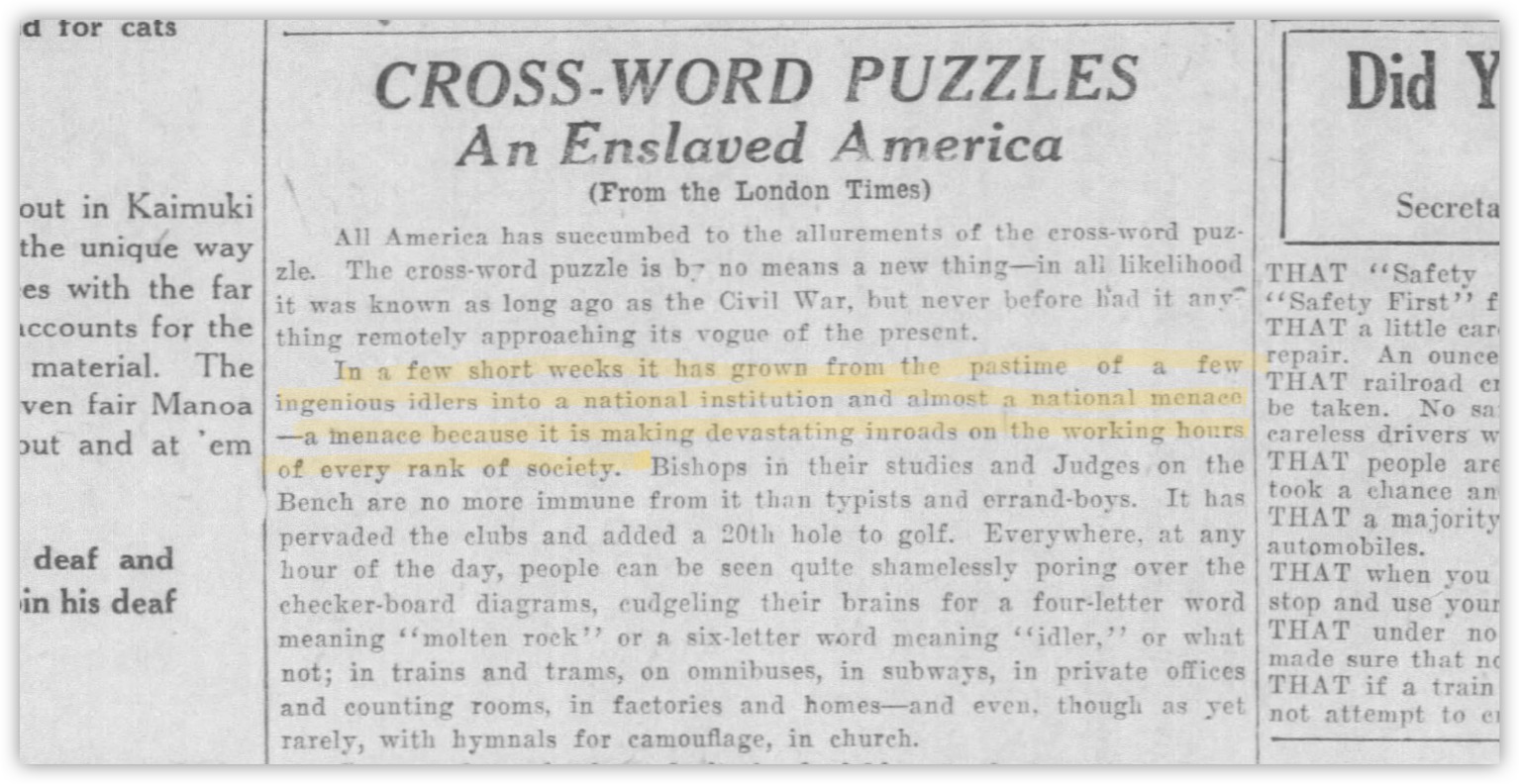“All America has succumbed to the allurements of the cross-word puzzle. In a few short weeks it has grown from the pastime of a few ingenious idlers into a national institution and almost a national menace: a menace because it is making devastating inroads on the working hours of every rank of society.”