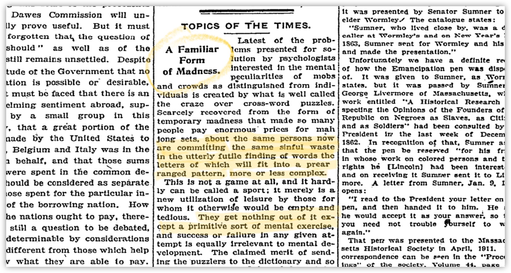 Across the Atlantic in the United Kingdom, the Times of London reported on the U.S. crossword craze with similar disdain, using an ironically tabloidesque headline “An Enslaved America.” Published in 1924, it read: