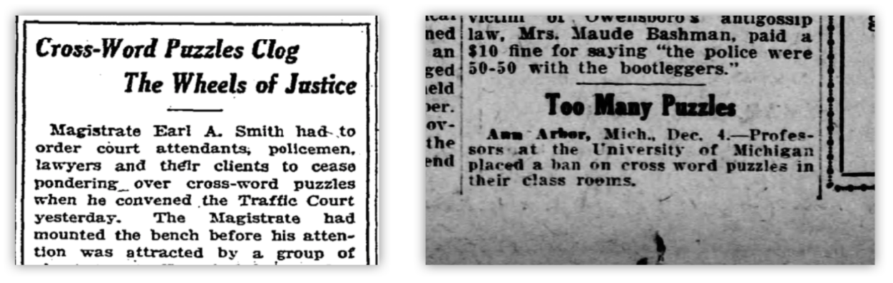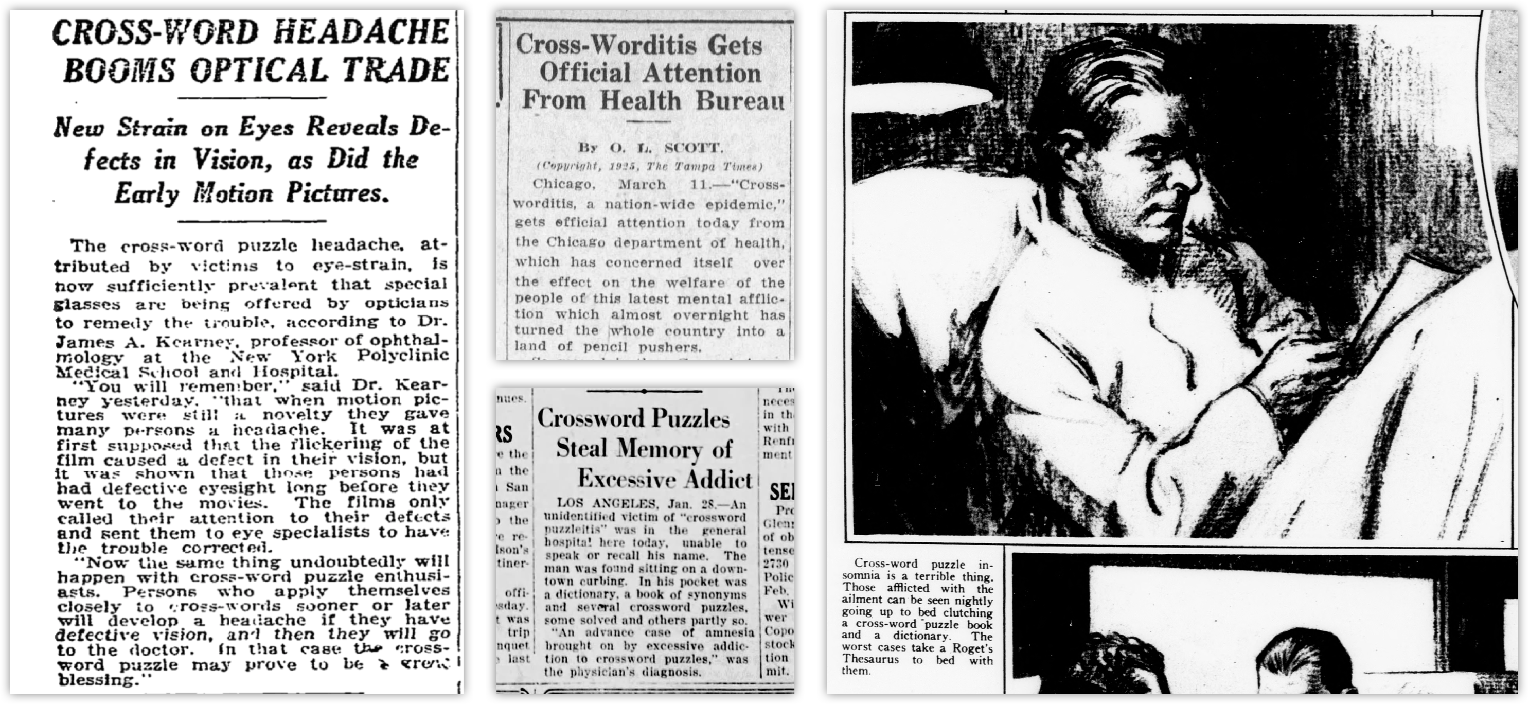 Back in the U.S., the crossword puzzle habit was being pathologized and medicalized, and the term “crossword puzzleitis” was coined — likely in jest — but it would eventually get attention from medical authorities and physicians. One doctor concluded “crossword puzzleitis” “stole” the memories of his patient. “Crossword insomnia” was another phenomenon reported, akin to late-night smartphone fiddling. Optometrists claimed the habit caused headaches and weakened eyesight.