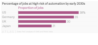 Nearly 4 out of 10 American jobs may be replaced through automation by the early 2030s, according to a new report by Price Waterhouse Cooper (PwC). In the report, the United States was viewed as the country most likely to lost jobs through automation–ahead of the UK, Germany, and Japan. This is probably not what the current administration had in mind with an “America First” policy.
