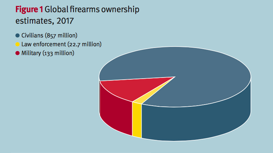 There are roughly a billion guns in the world, according to the latest data compiled by weaponry watchdogs the Small Arms Survey. Of these, a stunning 857 million are owned by private citizens, with only 133 million in the hands of authorized military forces and just 23 million used by law enforcement. This lop-sided ratio is getting more extreme, too—led by increases in U.S. purchases—with individuals possessing 650 million of the world’s firearms just ten years ago. These numbers include all firearms, of any type.