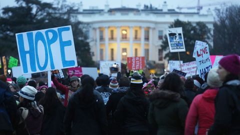 WASHINGTON, DC - JANUARY 21: Protesters gather outside the White House at the finish of the Women's March on Washington on January 21, 2017 in Washington, DC. Photo by Mario Tama/Getty Images