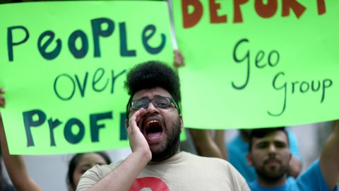 Photo: BOCA RATON, FL – MAY 04: Ruben Hayslette and other protesters gather in front of the GEO Group headquarters to speak out against the company that manages private prisons across the United States on May 4, 2015 in Boca Raton, Florida. The protesters are condemning what they say are the company’s active lobbying efforts to criminalize and imprison immigrants and people of color and then to make a profit off their imprisonment. (Photo by Joe Raedle/Getty Images)