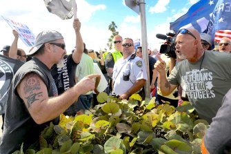 John Pope (L) expresses his disagreement with supporters of President Donald Trump near the Mar-a-Lago resort home of President Trump on March 4, 2017 in West Palm Beach, Florida. (Photo by Joe Raedle/Getty Images)