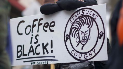Protestor Jack Willis, 26, (C) demonstrates outside a Starbucks on April 15, 2018 in Philadelphia, Pennsylvania. Police arrested two black men who were waiting inside a Starbucks which prompted an apology from the CEO