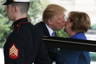 In a gesture that’s not a tradition in Germany, Trump kisses Angela Merkel on the cheek as she arrives at the White House. (Photo by Alex Wong/Getty Images)