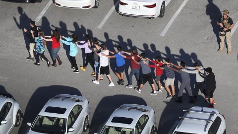 Students react at Marjory Stoneman Douglas High School in Parkland, Florida, a city about 50 miles (80 kilometers) north of Miami on February 14, 2018 following a school shooting. (Photo credit: MICHELE EVE SANDBERG/AFP/Getty Images)