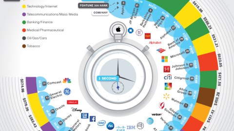 Beyond Apple, the three top finance companies — JP Morgan Chase, Berkshire Hathaway, and Wells Fargo — pull in $2,237.19 every second. (Mortgage company Fannie Mae is at a mere $389.38 per second, but still, yipes.)