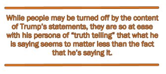 The science shows that people who are anxious about the future tend to lean more politically conservative. They want someone that is not going to act erratically, someone you can predict. Trump, while his statements are sometimes shocking, is at the very least consistent. What is most interesting is that while people may be turned off by the content of Trump’s statements, they are so at ease with his persona of “truth telling” that what he is saying seems to matter less than the fact that he’s saying it. That means that we as a public can think that Trump is sexist, racist, or whatever the inflammatory comment du jour is, and still be more comfortable with him as a candidate because he appears to not be lying or hiding his feelings.