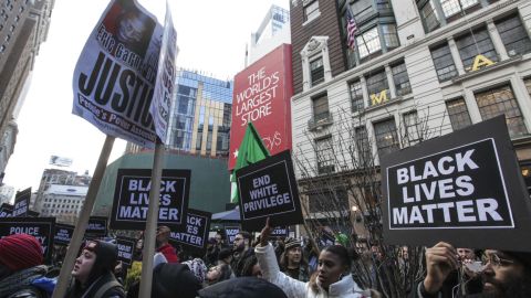 With the second non-indictment of a white police officer who killed an unarmed black man in two weeks, the chant “no justice, no peace” continues to ring out in protests around the country. On Wednesday, after the New York City grand jury declined to indict the police officer who put Eric Garner in the chokehold that led to his death, CNN reports, “hundreds of demonstrators gathered at various points in Manhattan… marching peacefully north as crowds formed near Rockefeller Center for the lighting of the Christmas tree. ‘No Justice. No peace,’ they chanted. ‘No racist police.’ “