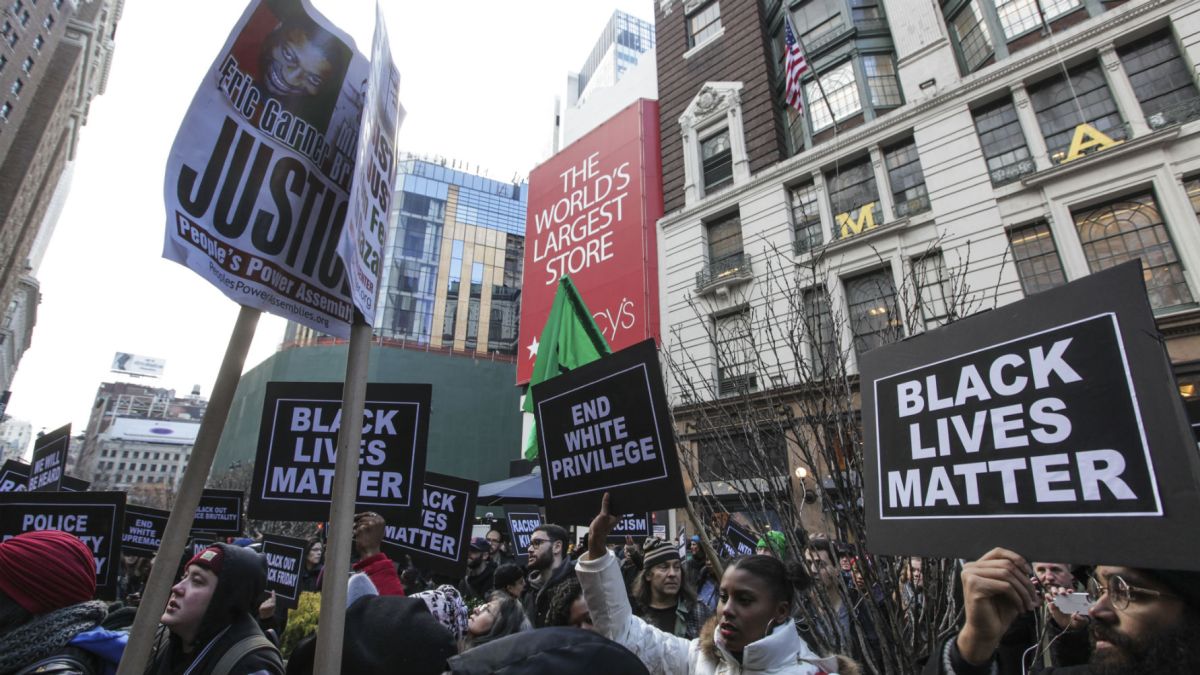 With the second non-indictment of a white police officer who killed an unarmed black man in two weeks, the chant “no justice, no peace” continues to ring out in protests around the country. On Wednesday, after the New York City grand jury declined to indict the police officer who put Eric Garner in the chokehold that led to his death, CNN reports, “hundreds of demonstrators gathered at various points in Manhattan… marching peacefully north as crowds formed near Rockefeller Center for the lighting of the Christmas tree. ‘No Justice. No peace,’ they chanted. ‘No racist police.’ “