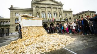 A rally in favor of the defeated Swiss referendum; there are eight million coins here, one for each Swiss citizen.