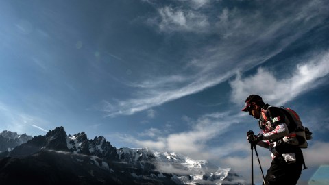 An ultra trailer walks past the Mont Blanc at La Flegere path on September 2, 2018 near Chamonix, as he competes during 170 km Mount Blanc Ultra Trail (UTMB) race around the Mont-Blanc, crossing France, Italy and Switzerland. (Photo by Jeff Pachoud/AFP/Getty Images)