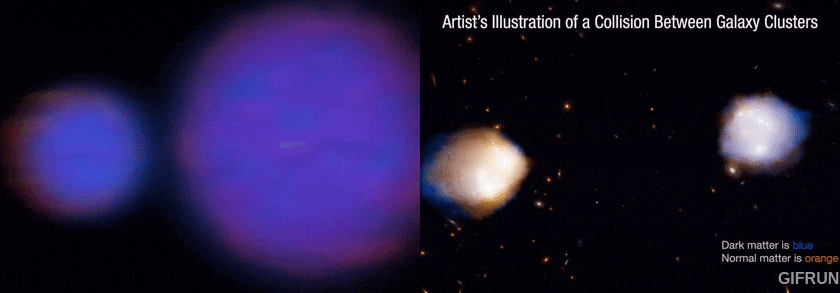 According to our theory of cosmic structure formation, galaxy clusters should exhibit certain ranges of speeds when they collide, of anywhere from ~1000 km/s up to around ~4000 km/s, but probably not much greater. These colliding cluster systems provide strong evidence for the existence of dark matter, as they show a separation between normal matter (identifiably from X-ray emissions) and the observed gravitational signal (inferred from gravitational lensing).