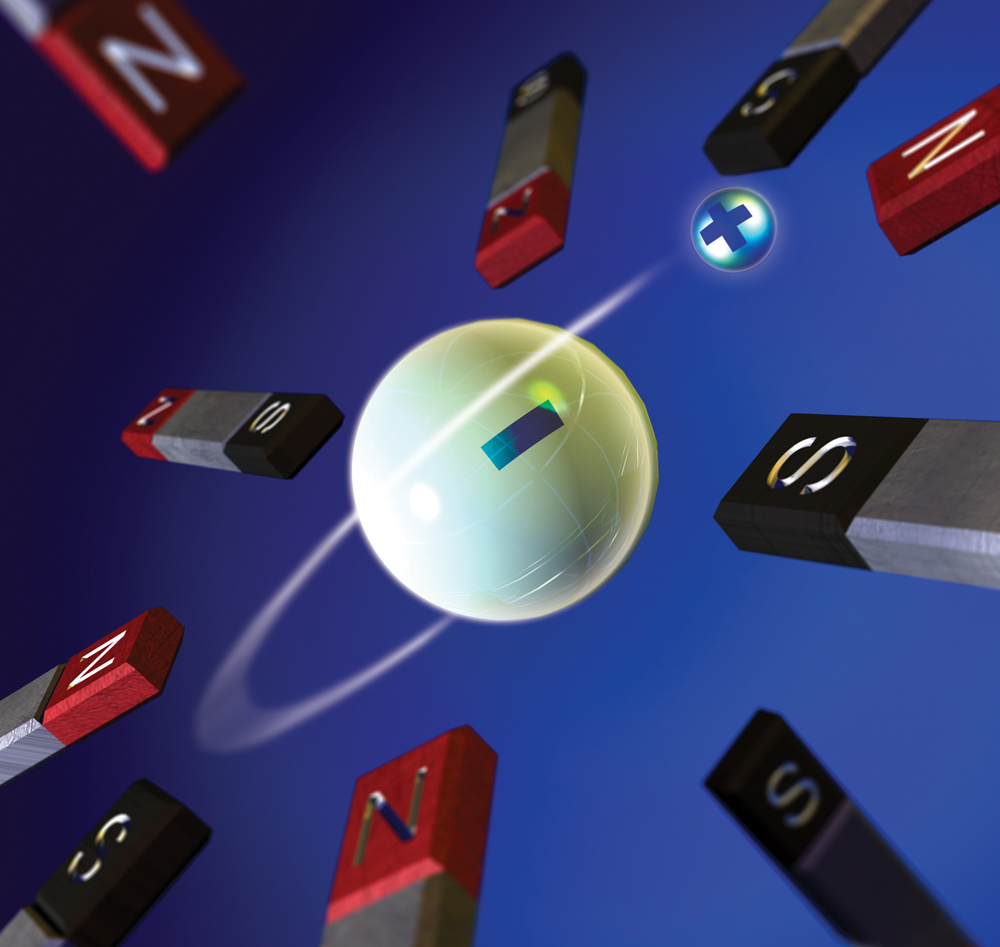 Just as an atom is a positively charged, massive nucleus orbited by one or more electrons, anti-atoms simply flip all of the constituent matter particles for their antimatter counterparts, with positron(s) orbiting the negatively-charged antimatter nucleus. The same energetic possibilities exist for antimatter as matter. (Credit: Katie Bertsche/Lawrence Berkeley Lab)