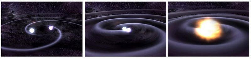 The Universe has many other objects of interest that produce large-magnitude gravitational waves. Supermassive black holes at the centers of galaxies swallow gas clouds, planets, asteroids, and even other stars and black holes all the time. Unfortunately, since the event horizons are so much larger, they take too long to orbit and occur in the wrong frequency range for LIGO to see them. White dwarfs, binary stars, and other planetary systems suffer the same problem: these objects are physically too big, and therefore take a long time to orbit. They all take so long, in fact, that we’d need a space-based gravitational wave observatory — like LISA — to see them. But there’s another hope for LIGO that has that same combination (massive, compact, right frequency) to be seen: merging neutron stars.