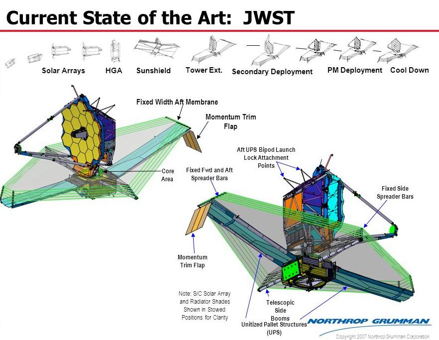 In order to deploy the sunshield, aft and forward sunshield pallets, as well as other support and protective structures, must first come out and deploy properly. Only then, once the proper setup is in place, can the sunshield come out and be tensioned. (Credit: Northrop Grumman)