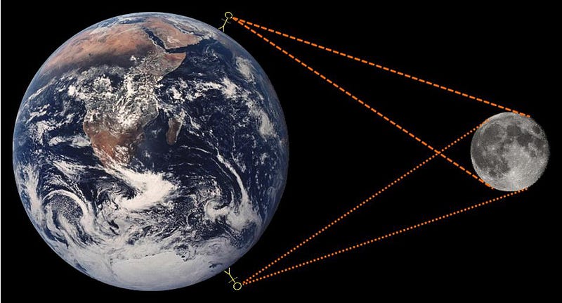 By looking at the curvature of the Earth’s shadow that falls on the Moon, we can reconstruct the relative size of the Moon versus the Earth’s shadow-cone, allowing us to geometrically reconstruct the Earth-Moon distance. The Earth’s shadow falling on the Moon teaches us that our planet is more than 3 but less than 4 times the diameter of the Moon, and spheroidal in shape. (FRED ESPENAK / MRECLIPSE.COM)