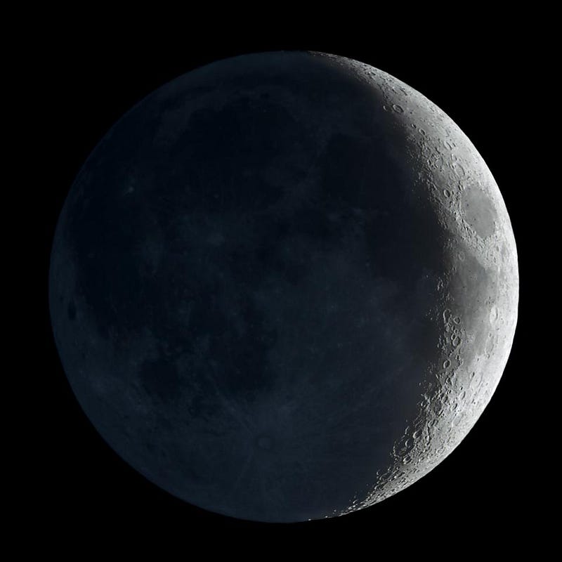 This amateur photograph shows a crescent Moon in detail: where a portion of the Moon is illuminated by the Sun, where craters are particularly visible along the terminator (the line between night-and-day), and the remainder of the Moon is dimly illuminated by reflected sunlight from Earth: Earthshine. (ROB PETTENGILL / FLICKR)