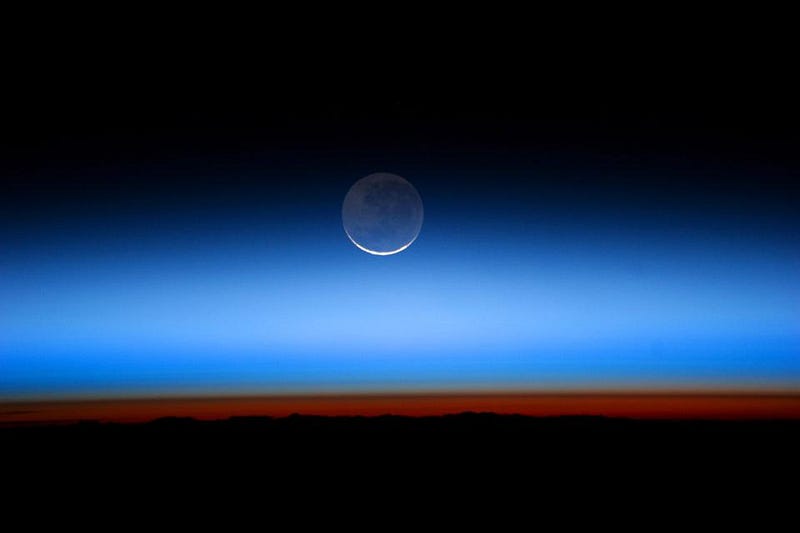The Moon as seen from a view above the majority of Earth’s atmosphere. Earthshine illuminates the majority of the Moon, which has only a tiny sliver lit up by the Sun. The light from the Moon passes through the Earth’s atmosphere a little bit, with the atmospheric color slightly affecting the camera’s view. (NASA)