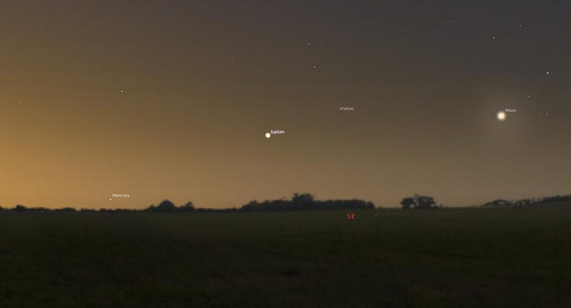 In the predawn sky on March 15, 2080, Jupiter and Saturn will be excellently positioned once again, experiencing another extremely close great conjunction, bringing them within 0.1 degrees of one another. Additionally, the Moon, Uranus, and Mercury all form an approximate line, where a dedicated observer with a clear east/southeast horizon could potentially view all of these worlds at once. (E. SIEGEL / STELLARIUM)