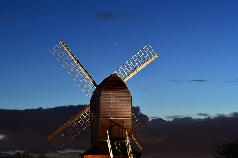 Jupiter and Saturn have been approaching slowly over the past few months. Here, this December 20, 2020 photo shows the pair after sunset over the famous windmill in Brill, England. Although they get close every 20 years periodically in their orbit, this will be the first time they are this close and visible (not in the Sun’s glare) since the year 1226. (Jim Dyson/Getty Images)