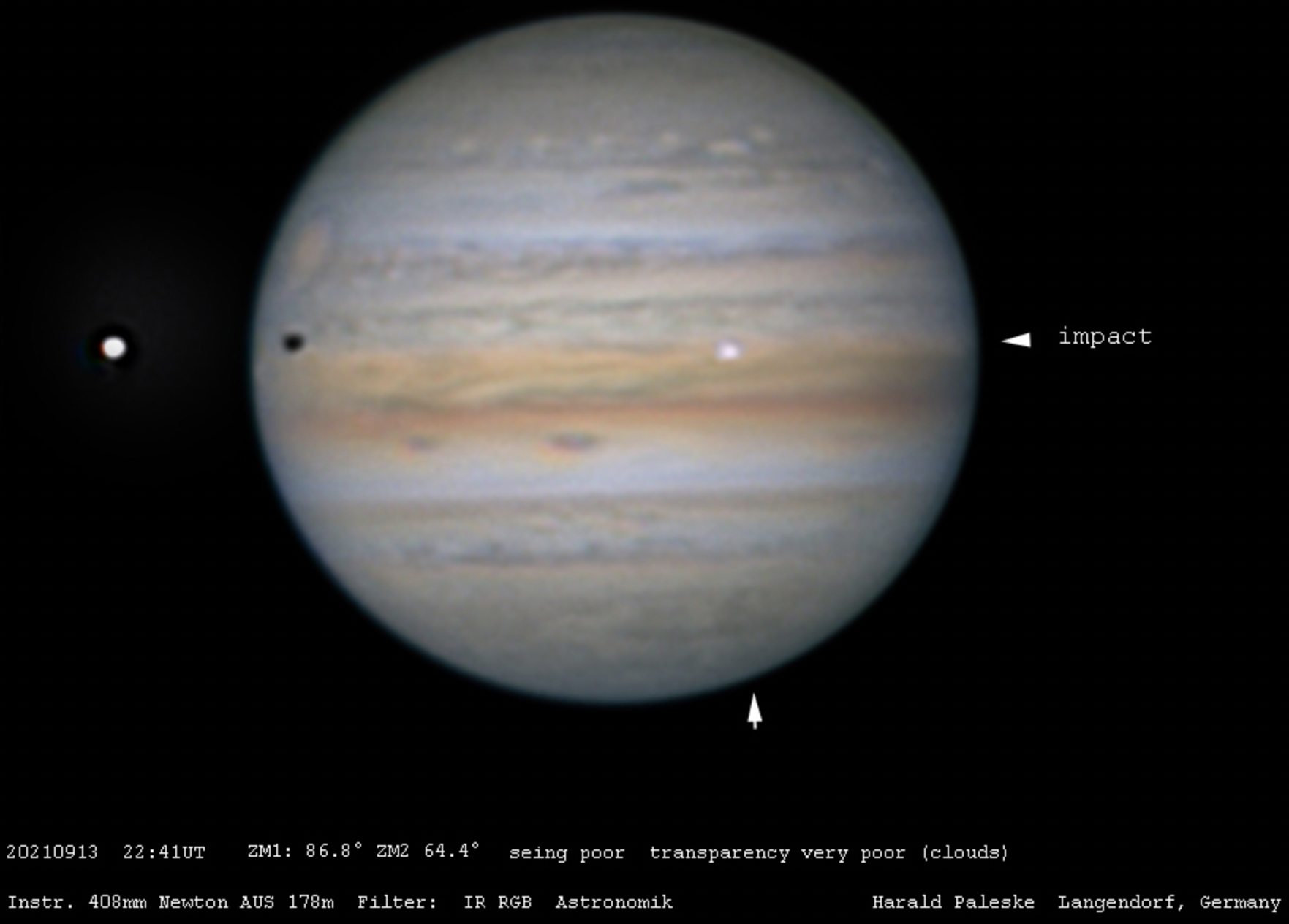 At approximately 10:40 PM UT, an impact event occurred on Jupiter on September 13, 2021, which appeared as a brief, transient flash of white light near Jupiter’s equator. This marks the 9th impact on Jupiter observed since 2009. Although Jupiter receives more impacts than any other planet in our Solar System, it doesn’t protect Earth, but rather increases our planet’s collision rate by approximately a factor of 3.5 over a scenario where Jupiter didn’t exist.