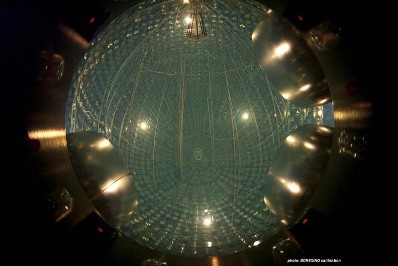 Numerous neutrino detectors, set up all across the surface of the Earth, are sensitive to the flux of neutrinos emitted by the Sun. If the number or energy of emitted neutrinos were to change, these neutrinos detectors would provide humanity’s first alert system, warning us of this change before a change in light signals or any other indicator arrived. (INFN / BOREXINO COLLABORATION)