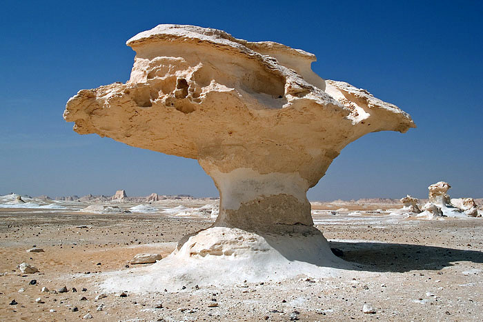This natural feature of eroded limestone in Egypt’s White Desert is one of many such structures where a massive boulder sits atop a natural, thinner pedestal. Erosion of different geological layers at different rates will often lead to unstable equilibrium configurations such as this.