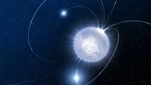 Neutron stars have incredibly strong magnetic fields, with normal neutron stars coming in at approximately 100 billion Gauss and magnetars, the most powerful ones, at somewhere between 100 trillion and 1 quadrillion Gauss. (For comparison, the Earth’s magnetic field is about 0.6 Gauss.) While rotation works to flatten a neutron star into a shape known as an oblate spheroid, the magnetic fields ought to have the opposite effect, lengthening the neutron star along the rotating axis into a football-like shape known as a prolate spheroid.