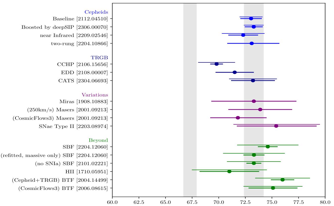 - That the early relic methods, including the CMB from Planck (but also from ACT, the South Pole Telescope, etc.) and from baryon acoustic oscillations (including DESI), support a low expansion rate of ~67 km/s/Mpc, with overall a low uncertainty of ~1%.