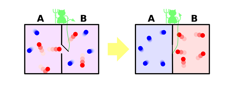 Imagine that you have this room full of hot-and-cold particles, and there is a central divider, but the particles are evenly distributed on both sides. Only, there’s a demon controlling the divider. Whenever a hot particle is going to smash against the divider from the “cold” side, the demon opens a gate, letting the hot particle through. Similarly, the demon also lets cold particles get through from the “hot” side. The demon has to put energy into the system to make this happen, and if you consider the demon to be part of the box/divider system, the total entropy still goes up. However, for the box/divider alone, if you were to ignore the demon, you’d see the entropy of just that box/divider system go down.