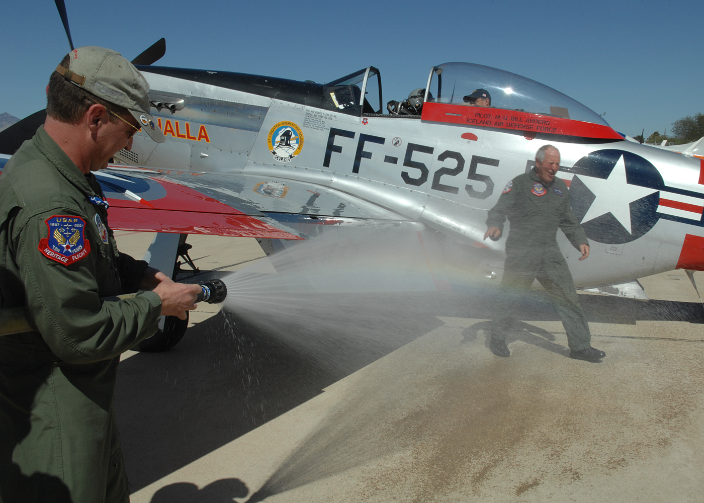 Bill Anders, at left, gets playfully sprayed with a hose by his son Greg Anders in this 2008 photo. Bill Anders remained an active pilot throughout his life, as this late-in-life (taken in 2008) photograph helps illustrate.