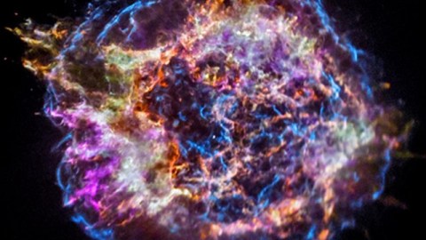This image from NASA’s Chandra X-ray Observatory shows the location of different elements in the Cassiopeia A supernova remnant including silicon (red), sulfur (yellow), calcium (green) and iron (purple). Each of these elements produces X-rays within narrow energy ranges, allowing maps of their location to be created. Image credit: NASA/CXC/SAO.