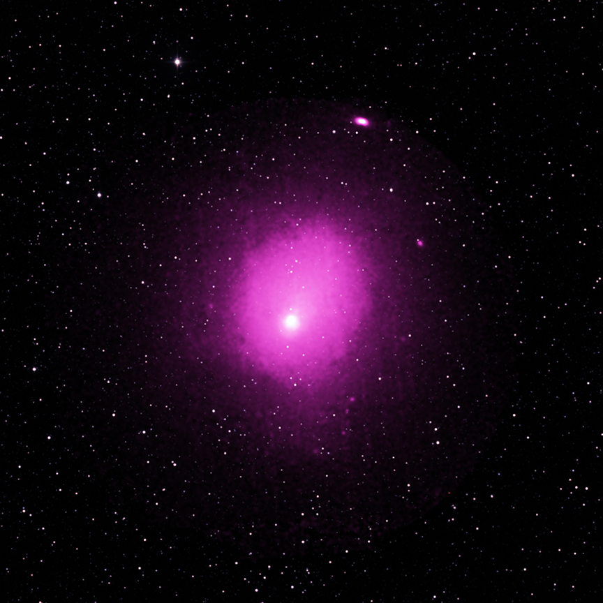The X-ray data, shown here in pink and overlaid atop the infrared data, transforms this nondescript cluster of galaxies into an enormously bright and large source in the sky. The X-ray data, even at a distance of 390 million light-years, takes up about a quarter of a degree on the sky: half the size of the full Moon.