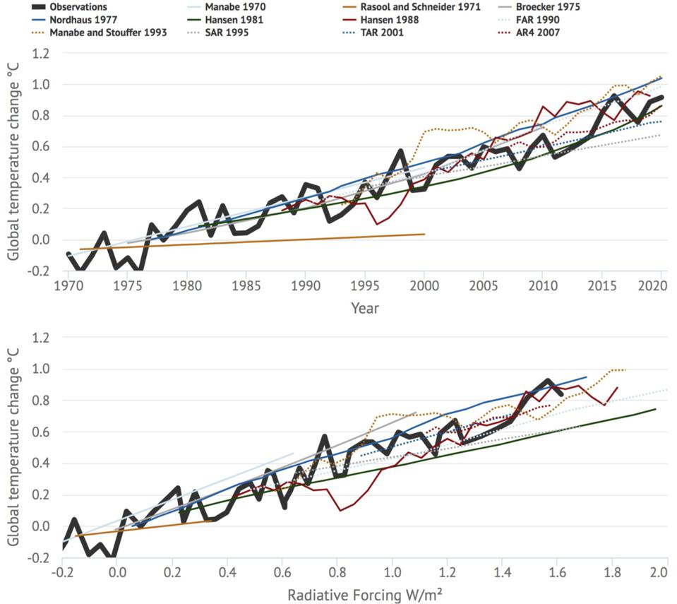 The enormous advance of the Manabe and Wetherald paper was to show that if you begin with an initially stable state — such as what Earth experienced for the thousands of years prior to the industrial revolution — you can tinker with a single component, like the CO2 concentration, and model how the remainder of the system evolves. (Wetherald died in 2011, so he was ineligible for the Nobel Prize.) Manabe’s first climate model successfully predicted the magnitude and time rate-of-change of Earth’s global average temperature as correlated with CO2 levels: a prediction that’s been borne out over more than a half-century. His work became the foundation for the development of today’s current climate models.