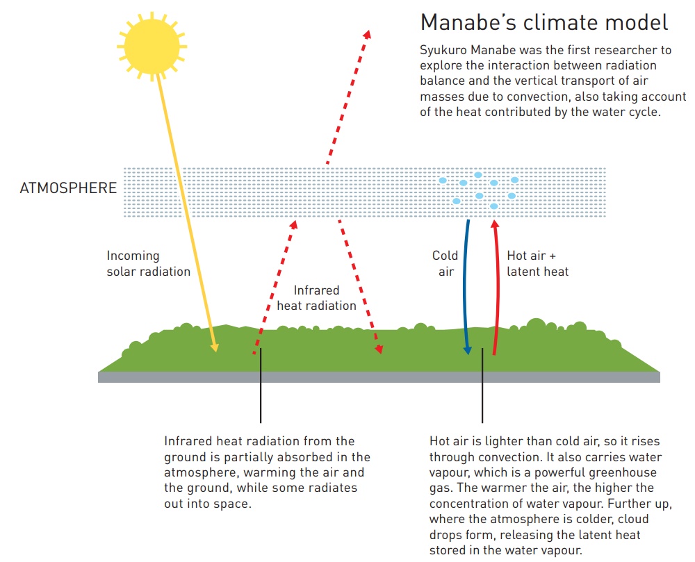 Manabe and Wetherald’s paper not only modeled these components, but also their feedbacks and interrelationships, showing how they contribute to Earth’s overall average temperature. For example, as the atmospheric contents change, so do the absolute and relative humidity, which alter the total global cloud cover, affecting the water vapor content and the cycling and convection of the atmosphere.