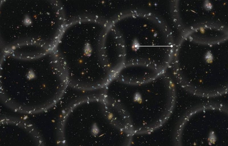 An illustration of clustering patterns due to Baryon Acoustic Oscillations, where the likelihood of finding a galaxy at a certain distance from any other galaxy is governed by the relationship between dark matter and normal matter. Image credit: Zosia Rostomian.